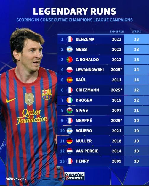 欧冠连续赛季进球纪录:本泽马、梅西连续18赛季进球第1