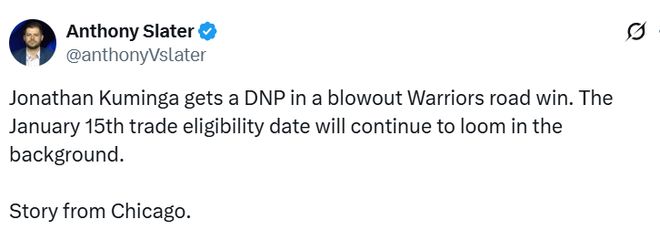 北京时间12月8日,勇士队内薪资第四高的球员库明加,在球队123-91大胜公牛的比赛中,并未进入11人出战名单,而本场比赛勇士本就缺少了库里、格林和霍福德三大主力。勇士队记Slater报道如下——