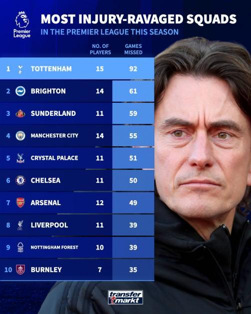 北京时间11月25日,德转统计出了本赛季伤病最多的10支英超球队,托特纳姆热刺以15名球员受伤,合计缺阵92场比赛排名第一,曼城在榜单上位列第四,切尔西第六,阿森纳第七,利物浦第八。